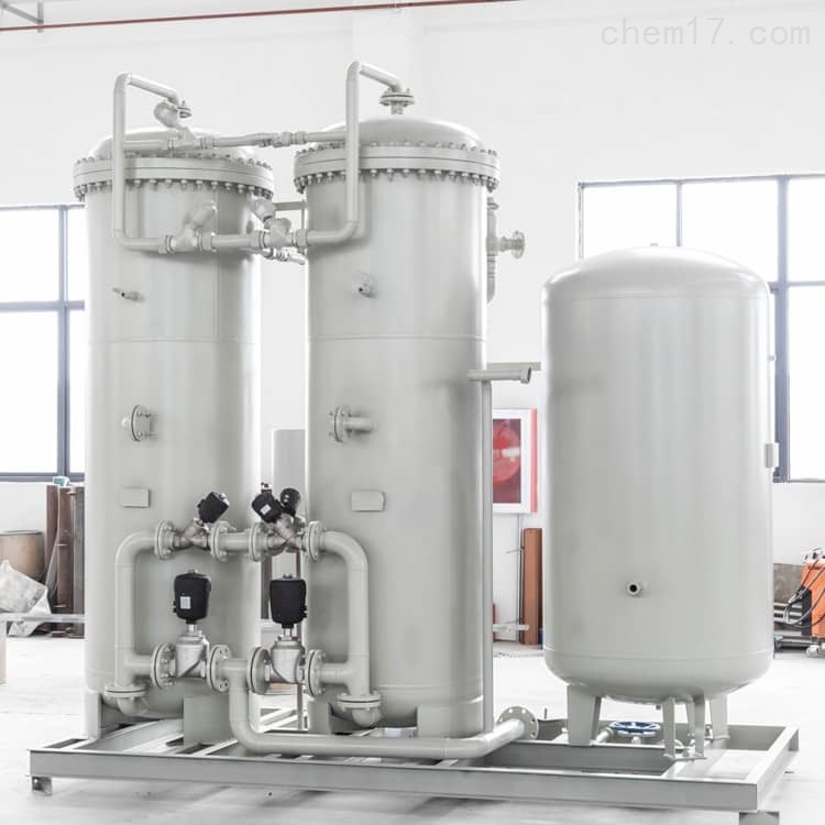 变压吸附制氮是以洁净、干燥的压缩空气为原料,利用一种高选择性的固体吸附剂(碳分子筛)对氮和氧的选择性吸附的性能把空气中的氮和氧分离出来。碳分子筛是非极性分子,优先吸附氧。碳分子筛对氧和氮的分离作用主要是基于这两种气体在碳分子筛表面的扩散速率不同,较小直径的气体(氧气)扩散较快,较多进入分子筛固相,较大直径的气体(氮气)扩散较慢,较少进入分子筛固相。这样气相中就可以得到氮的富集成分。一段时间后,分子筛对氧的吸附达到平衡,根据碳分子筛在不同压力下对吸附气体的吸附量不同的特性,降低压力使碳分子筛解除对氧的吸附,这一过程称为再生。变压吸附法通常使用两塔并联,交替进行加压吸附和解压再生,从而获得连续得氮气流。