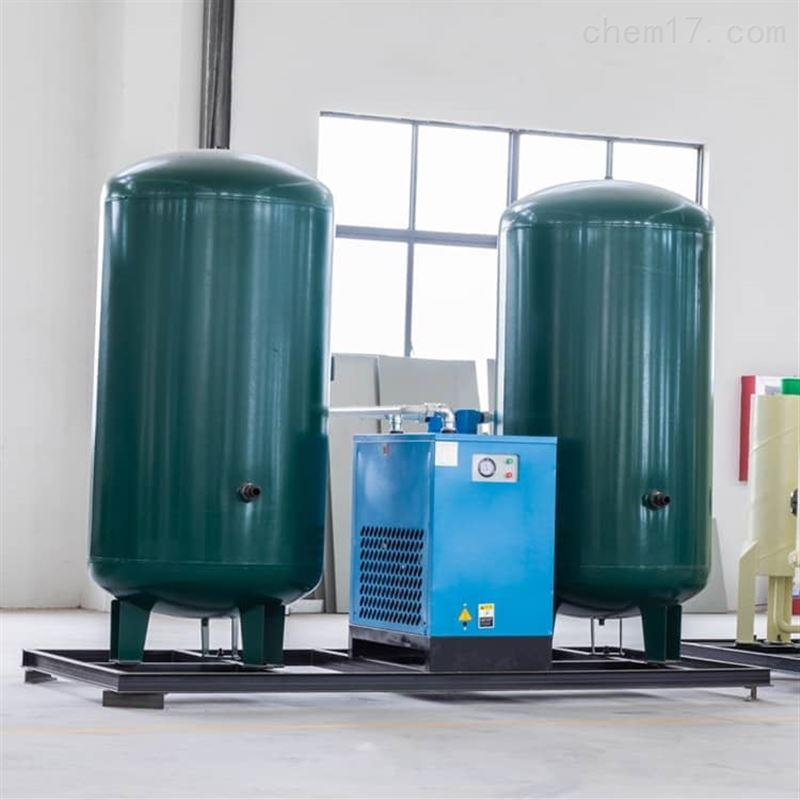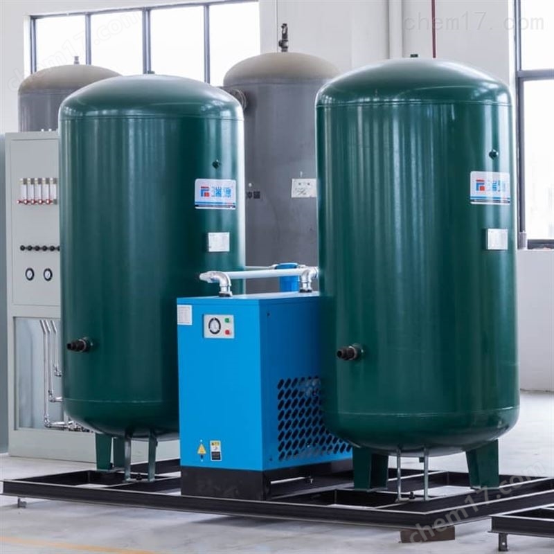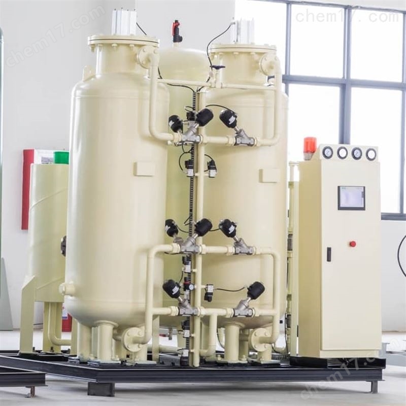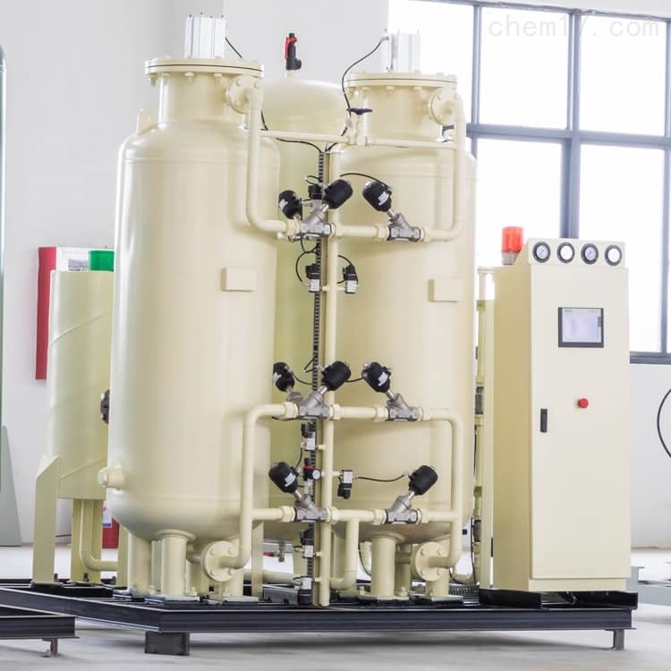 变压吸附制氮是以洁净、干燥的压缩空气为原料,利用一种高选择性的固体吸附剂(碳分子筛)对氮和氧的选择性吸附的性能把空气中的氮和氧分离出来。碳分子筛是非极性分子,优先吸附氧。碳分子筛对氧和氮的分离作用主要是基于这两种气体在碳分子筛表面的扩散速率不同,较小直径的气体(氧气)扩散较快,较多进入分子筛固相,较大直径的气体(氮气)扩散较慢,较少进入分子筛固相。这样气相中就可以得到氮的富集成分。一段时间后,分子筛对氧的吸附达到平衡,根据碳分子筛在不同压力下对吸附气体的吸附量不同的特性,降低压力使碳分子筛解除对氧的吸附,这一过程称为再生。变压吸附法通常使用两塔并联,交替进行加压吸附和解压再生,从而获得连续得氮气流。