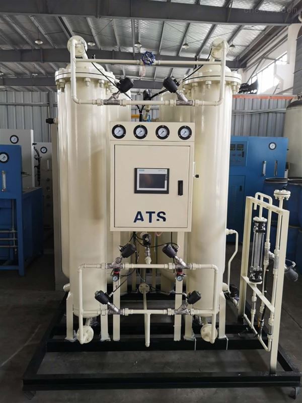 变压吸附制氧装置以洁净的压缩空气为原料,采用高品质的沸石分子筛作为吸附剂,在一定的压力下,从空气中制取氧气。经过纯化干燥的压缩空气,在吸附器中进行加压吸附、减压脱附。由于空气动力学效应,氮在沸石分子筛微孔中扩散速率远大于氧,氮被沸石分子筛优先吸附,氧在气相中被富集起来,形成成品氧气。然后经减压至常压,吸附剂脱附所吸附的氮气等杂质,实现再生。一般在系统中设置两个吸附塔,一塔吸附产氧,另一塔脱附再生,通过PLC程序控制器控制气动阀的启闭,使两塔交替循环,从而取得纯度较高的氧气(93%±3%)。