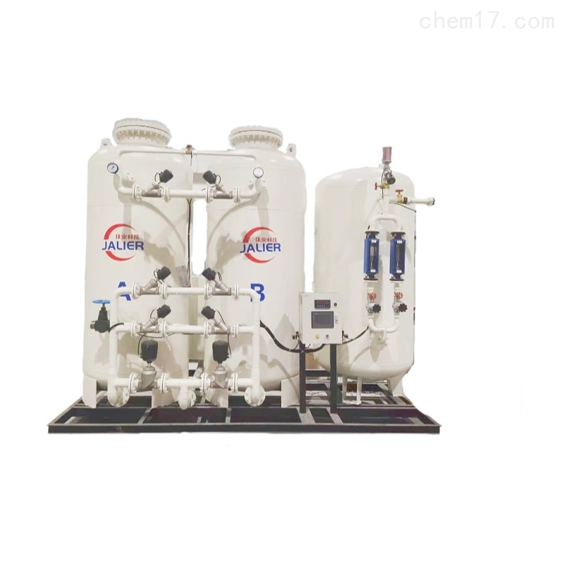 变压吸附制氧装置以洁净的压缩空气为原料,采用高品质的沸石分子筛作为吸附剂,在一定的压力下,从空气中制取氧气。经过纯化干燥的压缩空气,在吸附器中进行加压吸附、减压脱附。由于空气动力学效应,氮在沸石分子筛微孔中扩散速率远大于氧,氮被沸石分子筛优先吸附,氧在气相中被富集起来,形成成品氧气。然后经减压至常压,吸附剂脱附所吸附的氮气等杂质,实现再生。一般在系统中设置两个吸附塔,一塔吸附产氧,另一塔脱附再生,通过PLC程序控制器控制气动阀的启闭,使两塔交替循环,从而取得纯度较高的氧气(93%±3%)。